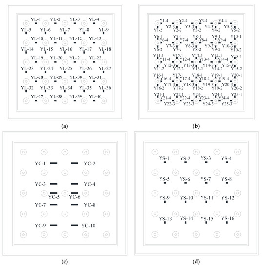 In order to assess the strain distribution of specimens under the combined action of the bending moment and water pressure, 80 strain measuring points, numbered Y1-4 to Y25-3, were arranged at the weld joints inside the PP waterproof plate. Forty strain measuring points were arranged in the middle of the span of the two nodes on the outside of the PP waterproof plate, numbered YL-1 to YL-40. Sixteen strain measuring points were arranged in the middle of the four-node span, numbered YS-1 to YS-16. Ten strain gauges, numbered YC-1 to YC-10, were arranged on the concrete surface, as illustrated in Figure 3.