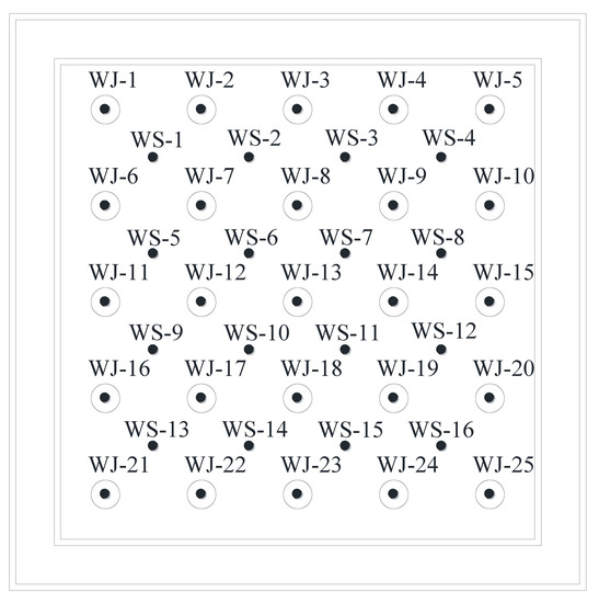 Furthermore, to measure the maximum displacement and the displacement at the joints of the PP waterproof plate, and to explore the displacement change rule of the specimen, 25 displacement measuring points were arranged at the outer joints of the PP waterproof plate, numbered WJ-1 to WJ-25, and 16 displacement measuring points were arranged at the middle of the four-node span, numbered WS-1 to WS-16, as shown in Figure 4.