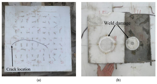 The test loading was divided into two stages: uniform load loading and water pressure loading. In the stage of uniform load loading, the deformation of the specimen was small, in general. When the target load was 21.21 kN/m2, the load pressure was kept unchanged. Then, when the pressure was increased to 76 kPa, the No. WJ-20 node was damaged, and the water pressure in the specimen dropped to 63 kPa at that time. When the water pressure was loaded to 85 kPa, the PP waterproof plate was damaged. The failure position of the specimen is shown in Figure 5a. The waterproof plate at node WJ-19 was cut, as presented in Figure 5b; the weld between the connecting plate and waterproof plate at this node was torn, although the bolts and the connecting plate were well-connected.