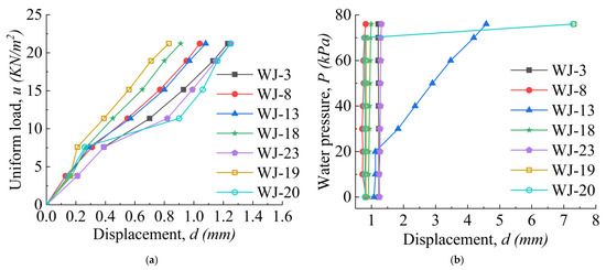 The displacement at each node increased linearly with the increase in uniform distributed load. When the load reached the maximum value of 21.21 kN/m2, the maximum displacement of 1.25 mm appeared at No. WJ-23. The displacement–load curve is shown in Figure 6a.