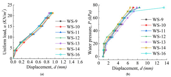 When the water pressure was less than 20 kPa, its displacement did not change significantly; when the water pressure was greater than 20 kPa, its displacement increased with the increase in the water pressure; when the water pressure reached 76 kPa, the maximum displacement appeared at WS-16 with a maximum value of 12.66 mm, as presented in Figure 7b.