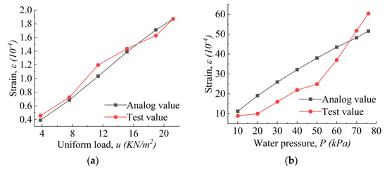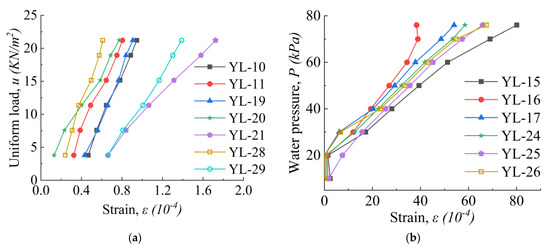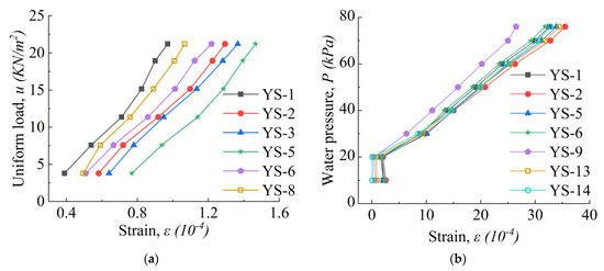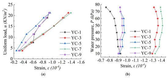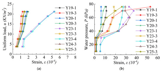 Concrete strain–load curve: (a) strain–uniform load; (b) strain–water pressure.