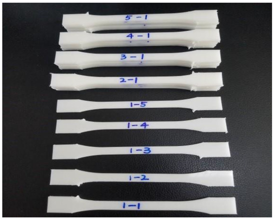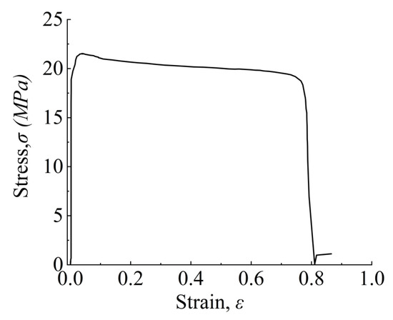 In the numerical analysis, the material properties of polypropylene plastics were measured according to [57]. The sample is presented in Figure 12, and the stress–strain curve obtained through the tensile test is shown in Figure 13. The elastic modulus Poisson ratio, tensile yield stress, and tensile yield strain are 1430 MPa, 0.48, 21.5 MPa, and 3.7%, respectively.