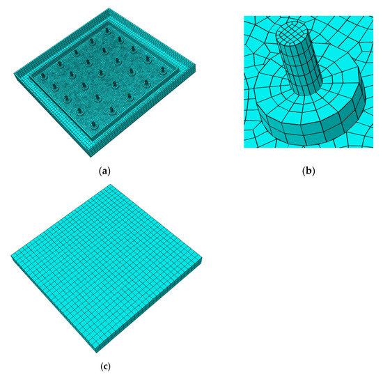 In order to ensure the accuracy of the numerical results, an eight-node linear hexahedron linear reduction integral element (C3D8R) was used for the PP waterproof plate, PP connecting plate, PP bolt, plastic formwork, watertight plastic plate, and concrete; and the truss element (T3D2) was used for the steel mesh. The grid size of the PP waterproof plate and plastic template was 40 mm, and the grid size of the waterproof plastic plate was 20 mm, as shown in Figure 14a. The grid size of the PP stud and PP connecting plate was 14 mm, as presented in Figure 14b. As the stress of concrete and steel mesh was not the focus of this analysis, the grid sizes of concrete and steel mesh were 60 and 40 mm, respectively. The concrete mesh division is illustrated in Figure 14c.