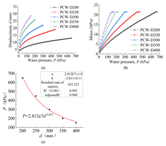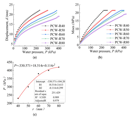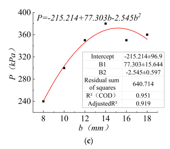 It can be seen from Figure 19 that the relation between the water pressure-bearing capacity P and the thickness of the waterproof plate b is nonlinear, and the function relation between them can be obtained by fitting as follows: