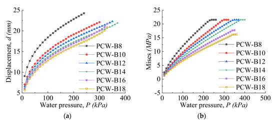 Under the compound action of the bending moment and water pressure, the mid-span displacement of four joints of each specimen increased with the increase in water pressure under different thicknesses of the waterproof plate, i.e., 8, 10, 12, 14, 16, and 18 mm. The maximum displacements were 24.63, 24.24, 22.28, 21.91, 21.71, and 20.88 mm, respectively. When the mid-span displacement of the four joints reached the maximum value and the thickness of the waterproof plate was less than or equal to 14 mm, the stress at the joints of the waterproof plate reached the PP yield stress. When the thickness of the waterproof plate was greater than 14 mm, the PP bolt yielded before the waterproof plate. The maximum mid-span displacement of the four nodes decreased with the increase in the plate thickness. When the plate thickness increased from 8 to 18 mm, the displacement decreased by 11%, as shown in Figure 19a.