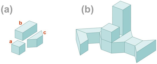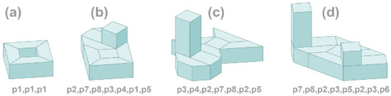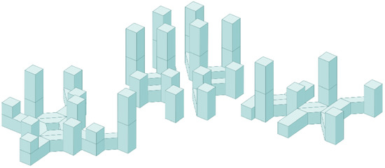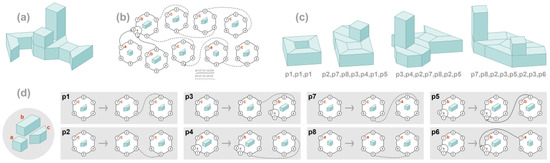 From a procedural point of view, the proposed conceptual concept scheme can apply to most computer-supported artifacts generating processes as well as to those created by humans [35]. We start with the selection of a constructive procedure, and then we select the elements that ensure the operation of the constructive procedure. In the proposed approach, the mutation and crossover operators make up a constructive procedure. Mutation and crossover operators are developed to increase the structural diversity of buildings. Initial elements to feed the procedure are presented in Figure 17c,d.