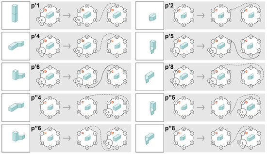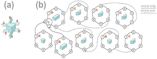 Let us consider the 3D prototype model shown in Figure 2b; it consists of nine components, including the transformed 3D primitives in Figure 2a. The model in Figure 2b is represented by its CP-graph in Figure 3b. For each object node, the graphic code for any its bond is a small circle placed on the border of the node or of the bond (for hierarchical bonds). Bonds are numbered and represent the faces of solids or parts of the faces for hierarchical bonds. The number of bonds, without hierarchical bonds, in an object node (see: the node with label a in Figure 3b) is equal to the face number of the cube represented by the object node (see: Figure 3a). The CP-graph in Figure 3b has an object node labeled b with two hierarchical bonds. In this case, this node has seven bonds. Instead of the sixth bond, bonds 6.1 and 6.2 are considered, which represent parts of the 6th face of the solid with label b. Object nodes are equipped with two types of bonds: source bonds and target bonds; directed edges are drawn from source bonds to target bonds. The edges of CP-graphs are labeled. Each edge in Figure 3b corresponds to one of the two adjacency relations, named as either end-to-end or end-to-side. For the sake of simplicity, edges are drawn as a dashed line for the first label and a solid line for the second. Bonds that are neither source nor target are called free, and they signal potential connections of their object nodes with other object nodes.