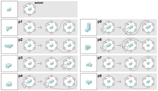 The system of the CP-graph rewriting rules for the 3D prototype model in Figure 2b.