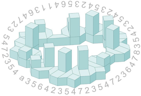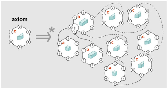 The urban complex presented in Figure 9 consists of buildings belonging to the design space under consideration. The following numerals in the figure read counterclockwise, starting with 3 on the right of the letter a, are the numbers of the rules applied.