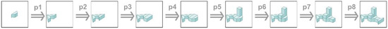 Following the idea of the architect John Frazer for genetic algorithm, possibilities of expressing a designer’s actions as generative rules are explored [7]. The designer creates a 3D prototype model by adding and attaching individual components. Figure 5 shows the steps of the designer during generating the prototype model and the eight CP-graph rules that generate CP-graph (Figure 2b), recreating that process. This CP-graph rewriting system is context-free; that is, all left-hand-side rules are CP-graphs containing exactly one object node. The right-hand side of each rule contains an isomorphic object node to the left-hand side of the rule (informally, a copy of the left-hand side of the rule) and a new node is connected to it.