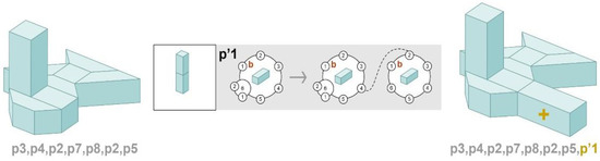 Consider the mutation operator applied to the building genotype shown in Figure 8c as a CP-graph rule sequence. The operator will add a new CP-graph rule to the rule sequence from which the structure of this building is generated. Only the primitives shown in Figure 2a are used to create new CP-graph rules, while new connections can be defined between the free bonds of object nodes appearing in the CP-graph in Figure 3b, which defines the structure of the prototype model shown in Figure 2b. As it has been considered, the free bonds of a CP-graph represent its potential connections. In that case, it is a natural extension of the CP-graph structure of the prototype model. This type of CP-graph rule will be called a structurally admissible rule.