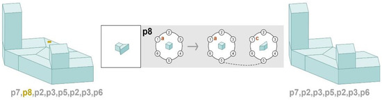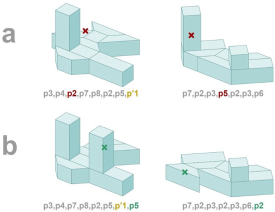 Let us consider a crossover operator for which its two arguments are sequences of CP-graph rules representing genotypes. Let us select the two buildings as arguments after applying operator mutations in Figure 10 and Figure 11. In this case, new offspring are first generated by mutating the parent copies. Figure 12a shows the arguments of the crossover operator and rules p2 and p5 (see: Figure 5) at the genotype level for changing the building genotypes. Figure 12b presents the results of the crossover operator.