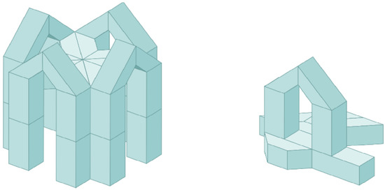 In this paper, a 3D prototype model will be visualized as a set of three-dimensional generic primitives, together with a set of spatial connectivity relations among them. It is based on the qualitative volumetric representation proposed by Irving Biederman, both as a model of human vision and a computer model in which 3D objects are constructed using three-dimensional structural components of objects called geons. Biederman developed the catalog of 36 geons that are classified by four qualitative features: edge (straight or curved), types of symmetry, size variation (constant, expanding), and axis (straight or curved) [14]. For instance, some geons in Figure 1 are truncated square pyramids; i.e., they are geons with the qualitative feature of size variation. These design objects represent so-called structural skeletons defined by their distinct parts attached. It is worth noting that in designing, it is always worth ensuring that the connection points between parts of objects are as clear as possible [24]. Two relations of attaching will be used between components of buildings: end-to-side and end-to-end.
