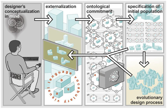 From the ontological point of view, representing knowledge formally is based on the designer’s conceptualization: the attributed objects that are assumed to exist in some area of interest and relations among them. Apart from the externalization of the designer conceptualization, we need its specification explicitly as input data for the system. In the proposed approach, the conceptualization is specified on the basis of the designer’s externalization that can be automatically transformed into an appropriate attributed CP-graph. There exists an ontological commitment between attributed CP-graph language as data for the system and the externalization of the designer’s conceptualization in the form of the visual language. It is worth noting that the CP-graph representing the prototype model, due to its free bonds, provides the potential to introduce structural admissible rules, i.e., CP-graph rules with new possible relations between components, which means CP-graphs represent an extensional type structure. The phases of obtaining the specification of conceptualization explicitly with the use of a visual environment and using it in the evolutionary design process are presented in Figure 16.