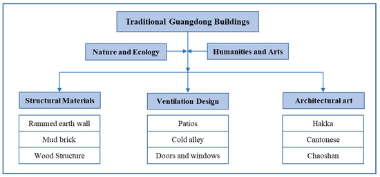 Due to its special geographical conditions, Guangdong has absorbed the essence of the Central Plains Han culture and characteristics of foreign cultures, resulting in architecture in which traditional buildings exhibit unique regional cultural connotations. The architectural design is adapted to the needs of nature and ecology and the arts and humanities. This paper investigates the technical process of using local materials to obtain structural materials. Traditional Guangdong buildings use patios, cold alleys and doors as well as windows in a comprehensive manner to create an energy-saving and environmentally friendly ventilation design, which was analyzed here. In addition, we study the floor plans and artistic characteristics of traditional buildings in different regions of Guangdong. Traditional Guangdong buildings realize the harmonious coexistence of humans and nature, as well as embody the concept of sustainable development. Traditional buildings integrate benefits and efficiency while condensing the surpassing wisdom and rich experience of craftsmen from ancient times to the present. Thus, it is worthwhile to research the connotation of traditional buildings to develop modern architectures.