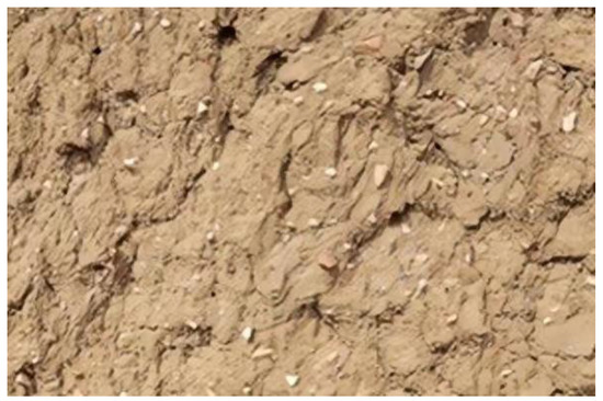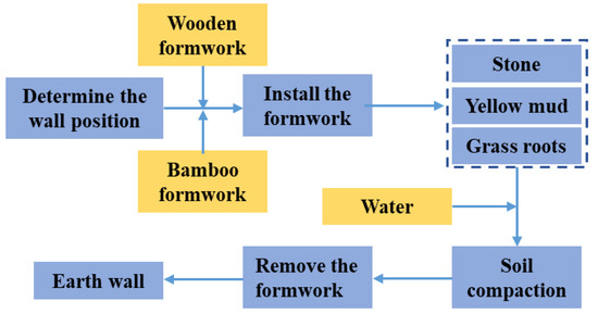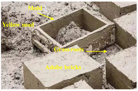 In certain ancient Hakka villages in northern Guangdong, ordinary traditional buildings are constructed with cheap, readily available materials, that is, the soil. The practice of constructing rammed-earth buildings and mud-brick buildings can be observed. “Banzhu” is a method of building walls by stamping earth between board frames. It represents a common technology for constructing traditional Chinese walls. The production process is shown in Figure 3. First, a mould is made with wooden boards or bamboo pieces at the position of the wall, and then, river stones, yellow mud and grass roots are mixed. The mixture is poured into the mould and compacted layer by layer. After a few days, the outer mould is removed, forming a rammed earth wall. It is time-consuming to build this type of wall, but such walls are very solid and durable. Obtaining material from local sources for buildings is a typical approach [4,5,6,7]. The method for constructing mud-brick buildings is similar to that used for rammed earth buildings (Figure 4). An appropriate quantity of river sand is mixed into field mud, and then dry straw is added as an aggregate to increase the strength. Water is added, and then the mass is mixed into a paste and compacted into a block using a pre-sized wooden form. After slowly drying, the mass can be demoulded and stacked to form a sturdy wall. Regardless of which construction method is adopted, earthen walls are generally plastered with a layer of loess or white ash on the surface to protect the inner and outer walls. However, this layer can easily fall off. With the development of craftsmanship, adobe bricks were gradually transformed into fired bricks. The outer walls of the buildings were constructed with blue bricks, and the surfaces were mostly fair-faced walls or whitewash.