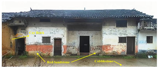 For example, the materials of traditional buildings exhibit regional characteristics in Donghuping, Shixing and northern Guangdong. As shown in Figure 5, the wall foundation is mainly red sandstone, which has a good moisture-proofing effect and can prevent rainwater from soaking the wall. Wealthy families often directly use stone masonry to construct the wall foundation, which can keep the building dry. Such walls mainly use yellow clay bricks bonded with lime–glutinous rice slurry, which ensures higher strength and more water resistance compared with pure lime mortar. This is because the glutinous rice slurry influences the carbonization reaction of calcium hydroxide, which changes the morphology characteristics of calcium carbonate grains and limits the growth space of particles. Thus, the microstructure of glutinous rice lime mortar is better. The use of this material can significantly improve durability and keep a structure stable for hundreds of years. The yard floor is paved with cobblestones, a simple construction process that allows rainwater to quickly penetrate the soil. The upper part of the building is a black–grey roof, and the lower part is plastered with yellow bricks and white ash. The combination of deep black and sharp white in the building, with simple, earthy yellow in the middle, represents the integration of heaven and earth.