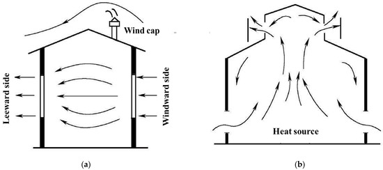 The two principles of natural ventilation. (a) Wind pressure ventilation; (b) hot pressure ventilation.