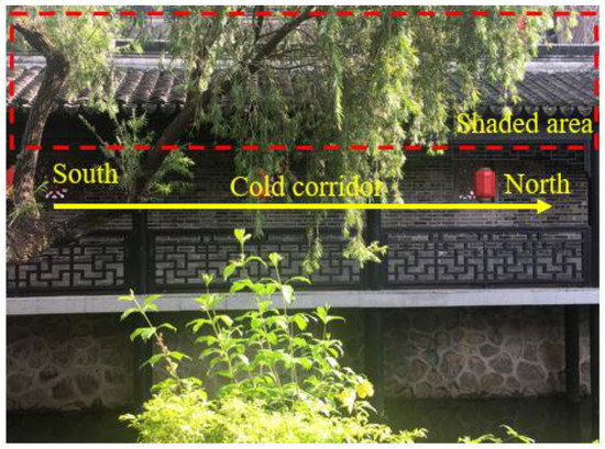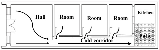 The cold alley is another common ventilation design element in traditional buildings and plays a role in improving the thermal environment [16]. A cold alley is a relatively narrow alley formed by the arrangement and combination of buildings or, alternatively, a small corridor left on one side of a building. It is an air duct with a small cross-sectional area. The wind pressure decreases as the wind speed increases, and the warmer air of each room connected to the cold alley is removed. Then, the cooler air enters the rooms and fills them, thus ventilating them. The patios of ordinary courtyard buildings are usually only affected by wind pressure. Adding cold alleys can create the effect of heat pressure. As shown in Figure 8, in Zhan Garden, Zhongshan, there is a shadow area formed by the building on one side of the roadway, and a temperature difference will form in the roadway, thereby creating hot pressure ventilation. Certain buildings have three-entry courtyards, and the ventilation effect is poor. In such cases, adding an alley on one or both sides of the courtyard is beneficial. This type of roadway not only solves the problem of traffic and fire prevention but also adapts to climatic conditions and achieves a good ventilation effect [17]. This effect is strongly related to directional orientation. As shown in Figure 9, the heat resources from the hall, rooms and kitchen are transported to the cold corridor and then concentrated to the patio. The cold corridor and the patio work synergistically for efficient ventilation. Because the dominant wind direction in Lingnan is southeast or south, most roadways run north to south to provide good ventilation.