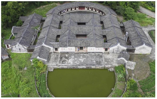 - Porretta, P.; Pallottino, E.; Colafranceschi, E. Minnan and Hakka Tulou. Functional, Typological and Construction Features of the Rammed Earth Dwellings of Fujian (China). Int. J. Archit. Herit. 2022, 16, 899–922. [Google Scholar] [CrossRef]
