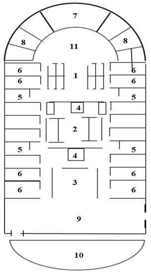 Dragon House floor plan. 1—Upper Hall; 2—Middle Hall; 3—Lower Hall; 4—Patio; 5—Hengwu Hall; 6—Hengwu Room; 7—Dragon Room; 8—Enclosed Room; 9—Heping; 10—Pond; 11—Flower Tire.