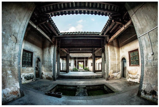 Judging from the basic shape of the dragon house, the open-air section between the main body of the building and the walls is a semicircular “flower tire”. The shape is like a pregnant woman’s slightly bulging belly, which corresponds to the “five-party dragon god” that symbolizes the birth gate of women under the lower abdomen, indicating that the dragon and the phoenix are born, and the descendants will be long-lived. In addition to the basic functions of irrigation and fire safety, the pond in front of the house has the special meaning of gathering wealth [25]. The ancestral hall is the heart of the Dragon House. In addition to its function as a space in which to worship ancestors, it serves for welcoming relatives and banqueting with guests. It can also serve as a place for the tribe to pass on traditional beliefs and customs and for spiritual belief and emotional sustenance [26,27].