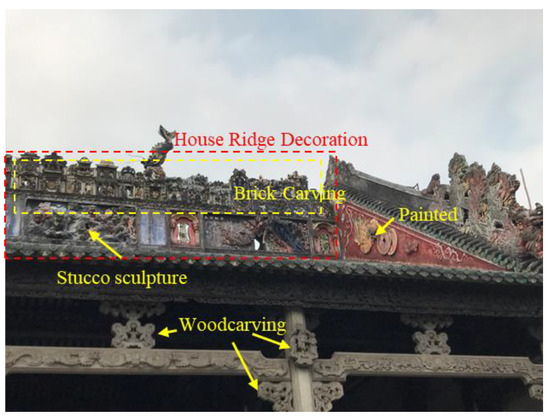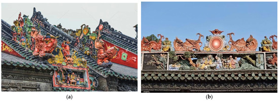 Grey sculpture is a unique outdoor decorative art found in Guangdong buildings. Its design is highly particular and has distinct layers and elaborate symbolism. It is mainly distributed on the roof and roof ridge (Figure 18). Because of its special decorative aspects, the production is relatively difficult. Thus, the grey sculpture of Chen Clan Temple represents the highest level of folk grey sculpture technology [32]. On the ridge of the nine halls of Chen Clan Temple, there are eleven pottery sculpture ridges. Each has a double-sided figure and flower ridge, tall in extent, rich in layers and complicated in decoration, with numerous characters and extensive scenes. It is a representative work of ceramic ridge art of the late Qing Dynasty. The ridge decoration is broadly divided into left, middle and right sections according to the decorative theme. A middle section is a group of large-scale theme opera scenes, the left and right sides are subtheme opera scenes, and the left and right ends are large figures or round dragon and phoenix sculptures.
