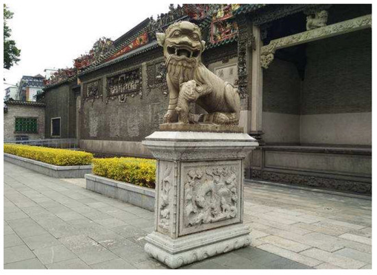 The solemn and grand architecture is integrated with eye-catching and elegant artistic elements, and the attention to detail calmly provides a bright yet subtle visual experience. All of the exquisitely elaborated decorations, such as roof ridges, cornices, doors and windows, patios, walls, steps, corridors, courtyards and interior furnishings, reflect the pursuit of perfection in details (Figure 14). Chen Clan Temple represents a collection of various artistic expressions and absorbed foreign classic decorative methods that integrate various techniques, such as stone carving, wood carving, brick carving, grey sculpture, pottery sculpture, copper and iron casting, and colour painting, all of which are commonly known as the Seven Wonders of Chen Clan Temple (Figure 16) [30]. Woodcarving represents a large proportion of the architectural decoration of Chen Clan Ancestral Hall, which can be described as “no wood without carving”. All the wooden structures in the building use the two techniques of relief and engraving. The artistry completely preserves the folk culture of the Lingnan area at the time the building was erected and condensed the surpassing wisdom and rich experience of craftsmen from ancient times to the present. For example, let us describe the twelve large double-sided engraved screens at the rear of the temple’s Juxian Hall, whose wood texture is on full display. The composition is strict and orderly, and skilled and vigorous carving is used to create vivid characters and complex scenes. The application of the scatter perspective technique enables plane woodcarving to evoke a three-dimensional sense of hierarchy. Another example is the niche cover of the three-entry lobby—another masterpiece of meticulous carving. It is tall and luxurious, and carved with a great number of dragons and phoenixes, figures and flowers; it is the largest Qing Dynasty woodcarving remaining in Guangdong [31]. In front of Chen Clan Temple is a pair of stone lions with peaceful demeanours (Figure 17). The male lion is stepping on a stone ball and looks proudly into the distance, symbolizing power. The lioness holds a cub in her paws, symbolizing the prosperity of the family. The smooth stone ball in the mouth of the male lion was carved whole using the engraving technique. It can rotate freely without falling out of the lion’s mouth. The four sides of the stone base under the lions are engraved with auspicious patterns, such as “Carp Leaping over the Dragon Gate”, “Danfeng Chaoyang” and “Lion Playing Ball”, with high relief techniques.