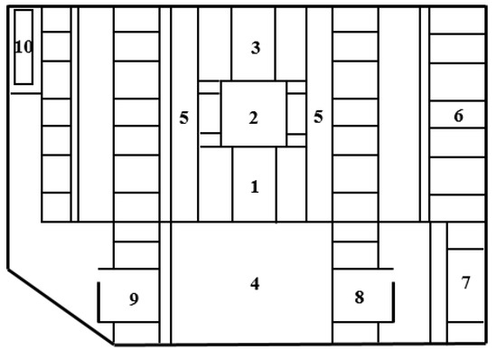 Floor plan of the Four Points Gold building. 1—Front Hall; 2—Patio; 3—Back Hall; 4—Qiancheng 5—Huoxiang; 6—Upper Book Hall; 7—Lower Book Hall; 8—Eastern Gate; 9—Western Gate; 10—Toilet.