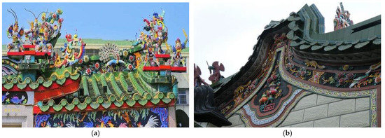 The climate in the Chaoshan area is hot and rainy (Figure 23). The annual average temperature is 23.2 °C, and the annual rainfall is approximately 1300 to 2000 mm, mostly concentrated from April to September. The salt content of the air in the region is high due to its proximity to the sea. Under such climatic conditions, decorations (such as the grey sculptures and paintings on the roofs of early buildings) are easily damaged, and craftsmen must focus on corrosion resistance and sturdiness. Seeking to prevent the roof decoration from being eroded by wind, rain and salt, artists were inspired by Jiaozhi pottery, which originated south of Five Mountains, Guangdong. They began to investigate and develop decorative components similar to Jiaozhi pottery, creating the porcelain inlay process, which continues to be used (Figure 24). For example, there are five different signs representing gold, wood, water, fire and soil on the ridge end of the gable. The five-star ridge decoration, gable, eaves, and other roof sections are all inlaid with porcelain. Inlaid porcelain is a type of folk art and a craft handed down from Chaoshan. The term refers to the use of variously coloured porcelain pieces inlaid in the form of various three-dimensional images on the main roof parts, such as the gables and eaves. These images include flowers and plants, birds and animals, insects and fish, as well as other natural imagery. The shapes are very expressive, and some mix the imaginary with the genuine. The inlaid porcelain not only resists erosion by wind, rain and salt but also becomes even more splendid after being exposed to rain and the sun because of the characteristics of the ceramic material [40]. The craft of inlaying porcelain was adapted to the climate characteristics of Chaoshan without losing decorative value. Therefore, it remains widely used in Chaoshan architecture and was included in the national intangible cultural heritage list in 2011.
