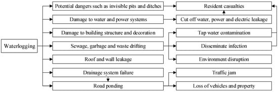 When the urban community suffers from a rainstorm and waterlogging, it accumulates rapidly on the community ground in a short time, resulting in community road blockage and traffic obstruction of vehicles and pedestrians; water inflow in the basement, garage, shop, and other places; and damage to walls, floors, and other indoor properties of ground floor residents. The residents on the top floor may have water leakage; Some infrastructure in the community is damaged or restricted. With the passage of time, the retention of sewage and garbage in the ponding pollute the community environment and accelerate the spread of diseases; furthermore, the people’s mood is affected, they are dissatisfied with the community management, and the community quality and value and residents’ harmony decline. The chain transmission of the impact of a rainstorm and waterlogging on the community is shown in Figure 1.