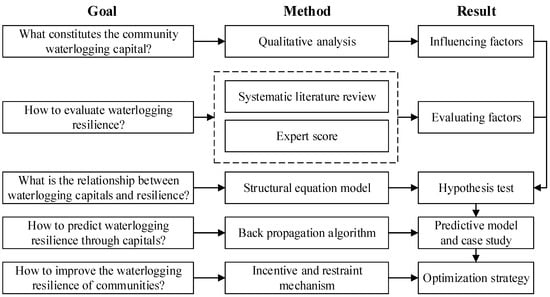 Taking the rainstorm and waterlogging in urban communities as an example, this study systematically explored the key problems of urban community resilience against waterlogging by using a variety of research methods. The main conclusions are as follows: (1) The definition of waterlogging resilience was analyzed from the urban or community resilience literature, combined with the organizational structure and disaster stakeholders of urban communities in China; the occurrence mechanism and impact chain of waterlogging disasters in urban communities were clarified. (2) Based on grounded theory and qualitative analysis, 19 key influencing factors of waterlogging resilience were determined. Combined with the SLR method and expert scoring, an evaluation index system of waterlogging resilience in complete dimensions was constructed. (3) The structural equation model can test the hypothetical linear relationship between indicators and clarify the mechanism of urban community resilience towards waterlogging. Taking this as the theoretical basis, according to the BP neural network modeling process, the sample data obtained from questionnaires are imported. Finally, a pre-disaster prediction model of waterlogging resilience was established, and the predicted value of target community resilience based on the anti-waterlogging capitals was obtained.