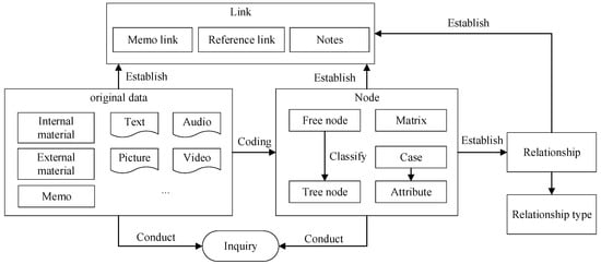 Axial coding aims to further refine and compare the initial categories formed in the open-coding stage to form higher-level main categories and analyze the logical relationships between the main categories and the initial categories in terms of cause and effect, process, similarity, and function. Selective coding, also known as three-level coding, aims to clarify the relationships among the main categories; refine and integrate them into a core category that can summarize all the above categories; and display the relationships among the core category, the main category, and the initial category in the form of a story line and integrate them into the same theoretical framework. In summary, the core category of this study is defined as “the influencing factors of anti-waterlogging resilience in Chinese urban communities”. Ultimately, 108 concepts and 13 initial categories were obtained from the 195 statements in the original material. Four main categories were obtained by axial coding, in turn, and finally one core category was obtained by core coding. The qualitative analysis process using the software Nvivo 11.0 is shown in Figure 3.