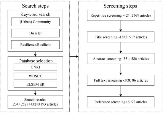 After applying the aforementioned indicator selection method, we finally determined 92 articles related to evaluation indicators for community waterlogging resilience. The specific process is shown in Figure 4.