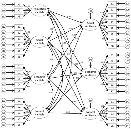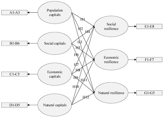 The structural equation model is a comprehensive statistical analysis method that integrates path analysis and factor analysis. SEM verifies the validity of a theoretical framework by establishing links between target data, including the following four important parameters: (1) endogenous variables, which are affected by other variables in the SEM, are pointed by a single arrow in the path diagram; (2) exogenous variables, which affect other variables but are not influenced by other variables; (3) latent variables, which cannot be directly measured but can be reflected by the corresponding observed variables; and (4) explicit variables, also known as observed variables, can be directly measured to obtain a definite value. Observed and latent variables can be both endogenous and exogenous in SEM. This study set population capitals, social capitals, economic capitals, and natural capitals as exogenous latent variables corresponding to 3–6 observed variables, respectively, and defined social resilience, economic resilience, and natural resilience as endogenous latent variables corresponding to 5–8 observed variables, respectively. A hypothetical model with 12 hypotheses was established, asserting that the stronger a community’s anti-waterlogging capitals are, the stronger its DPM capacity is, and the more resilient the community is, as shown in Figure 5.