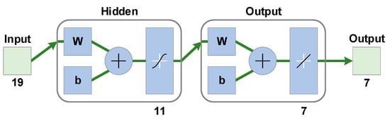 Based on the results of the previous structural equation model, three sub-prediction models for social, economic, and natural waterlogging resilience were developed. Taking economic waterlogging resilience as an example, we were influenced by four aspects, namely population capitals, social capitals, economic capitals, and natural capitals, containing a total of 19 observed variables. The number of hidden layers is taken as 11, and the initialization of the weights follows a uniform distribution based on BP network characteristics. The model for waterlogging resilience in Chinese urban communities is shown in Figure 7.