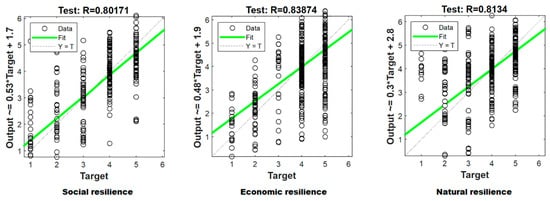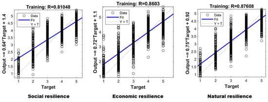 According to the above steps, the goodness of fit between the actual output values and the expected values for each sample were calculated in MATLAB, as shown in Figure 9. The R values of social, economic, and natural waterlogging resilience are all greater than 0.8, which has a good fit degree. Using the BP neural network algorithm above, a set of corresponding waterlogging-resilience evaluation index predicted values can be calculated from a set of influencing factors in the target community. (Note: When an index value exceeds 5, the default is taken as 5.) Thus, the waterlogging-resilience performance of urban communities in China can be predicted before the disaster.