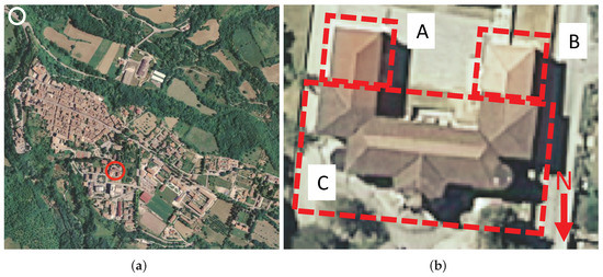 The school building aggregate studied in this paper, belonging to a typology widely studied in a seismic perspective in the last years [24,25], is located near the centre of Amatrice. The aerial view of the aggregate is reported in Figure 1a, while in Figure 1b, the three buildings belonging to the aggregate are evidenced. The main school building C was constructed from 1933 to 1936; the structural typology was masonry made by irregular stones interrupted at regular distance by horizontal layers of clay bricks. The original wooden roof was substituted in the 1970s by ribbed slabs, similar to those of the floors. Building C has two levels above ground and one level partly under ground. RC buildings A and B were added in 1990 and 2000, respectively. Both buildings A and B have two levels above ground, while building B also has one level under ground. The floor slabs of buildings A and B were made by hollow clay bricks and RC joists; the roof slab of building A consists of corrugated steel sheets supported by steel trusses, while for building B’s roof, the same typology of floors was used. Despite the fact that masonry and RC buildings were separated by structural joints, the roof did not have evident discontinuity of the tiles.