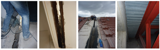 Details of the structural joints upgraded during the 2012 interventions (from left to right): increment of the distance between floor slabs; effective distance between floor slabs visible after the interventions; waterproof layer on the joint between two roof slabs; corrugated steel sheet between adjacent buildings A and C under the joint (photo courtesy of R. Amici).