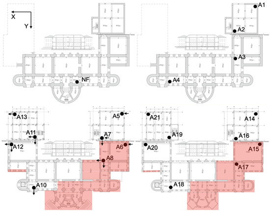As is well known, structural health monitoring (SHM) techniques can be applied on data gathered from a seismic monitoring system. Even if a comprehensive review of SHMs is outside the aim of this paper, the classification reported in [22] is of interest, where the approaches proposed in the literature are distinguished as being either model-based or signal-based. In the former approaches, damage is recognized through tracking variations in the simulated measurements from a structural model, and specific parameters of this model are updated under the system’s responses, as discussed, for example, in [23]. The latter approaches rely on statistical analysis and assess the system’s response independently; therefore, they do not require additional information concerning the structure’s physical properties and parameters. One of the main issues of signal-based techniques is the limitation of the number of response quantities. As discussed in the following, combining experimental and numerical results, available response quantities can be expanded in order to obtain much information at the local level, thus allowing the estimation of damage on all relevant structural elements.