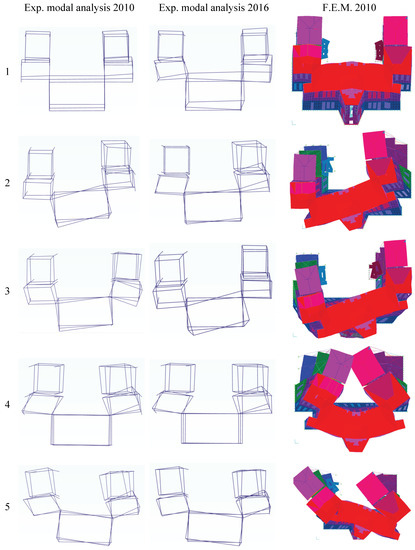 The results obtained in terms of natural frequencies are reported in Table 1 in the corresponding column. For FEM2016, the error is generally very small, between 0.3 and 1.7%. Only for the second mode is the error 4.2%; in this case, the mean error is 1.22%, greater than the 0.62% mean error obtained with FEM2010. The modal shapes obtained with model FEM2016 are not reported, because they are very similar to those of FEM2010 in Figure 5.