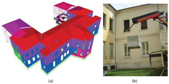 Like all other structures belonging to OSS, for this aggregate, a FEM has been developed in 2011 (Figure 6a) using a commercial software [27]. The a priori model characteristics were based on the geometry and material properties purposely investigated after the installation of the monitoring system; then, the parameters of the a priori model were updated to reasonably match experimental frequencies and mode shapes obtained by small vibrations induced on the structure by letting a RC block fall on the ground near the building at the monitoring system installation time (Figure 6b).
