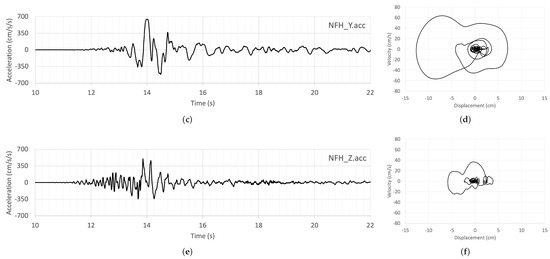 Acceleration time histories (a,c,e) and phase plane diagrams (b,d,f) at the base of the aggregate in the (a,b) X direction (see Figure 4); (c,d) Y direction; (e,f) Z direction.