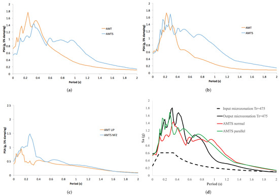 (a) The 5% damping acceleration response spectra measured by the OSS station (AMTS, blue curve) and by the RAN station (AMT, orange curve), with components projected in direction orthogonal to the fault; (b) like (a) but the components are projected in direction parallel to the fault; (c) like (a,b) but the vertical components are plotted; (d) comparison of AMTS response spectra with the results of the microzonation [33].