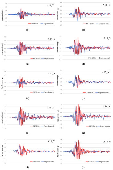 With reference to the performance of the aggregate, Figure 9 reports acceleration time histories recorded in some points during the 2016 earthquake. In the same figure, the simulations performed with the previously updated FEM2016 linear model are also depicted. As expected [12,13,14,15,16,17,18,19,20,21,34], the FEM2016 model is able to reproduce the real behaviour until the elastic limit is exceeded. After that, a significant period of elongation of the structure is evident in the experimental results. Nonetheless, the elastic model is capable of predicting rather well the maximum accelerations at various locations (Table 4). Obviously, for the portions of the structure affected by a collapse, this comparison is not significant. In any case, the mean error in terms of accelerations results are 7.6% at level 1, 12.9% at level 2 and 15.7% at level 3. This result seems rather interesting, considering the huge nonlinearity experienced by this structure.