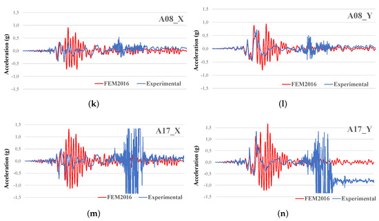 Time histories (time interval 11–22 s) of the recorded accelerations (Experimental), compared to the linear simulations (FEM2016): (a,b) Bldg. A lev. 2; (c,d) Bldg. A lev. 3 (roof); (e,f) Bldg. B lev. 2; (g,h) Bldg. B lev. 3; (i,k,l) Bldg. C lev. 2; (j,m,n) Bldg. C lev. 3.