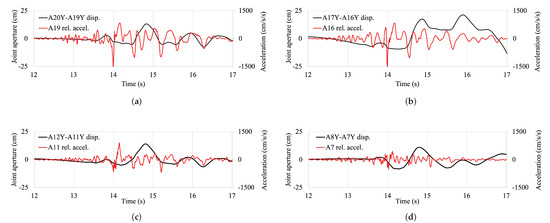 Time histories of the structural joint openings (in cm) between masonry and RC buildings (black curves) and of the relative (with respect to the ground) accelerations (red curves, in cm/s2): (a) level 3, joint near sensor A19; (b) level 3, joint near sensor A16; (c) level 2, joint near sensor A11; (d) level 2, joint near sensor A7. Sensor locations are reported in Figure 4.
