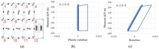 (a) Column numbers of building A. (b) Column 2, second inter-storey, X-direction rotation, moment-plastic rotation diagram. (c) Moment-total rotation diagram.