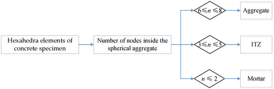 The specimen was divided into hexahedra elements of the same size using the mapping mesh method, and the attribute of each element can be determined according to the coordinates of element nodes and the center of spherical aggregate. The classification principle of each phase is shown in Figure 1.